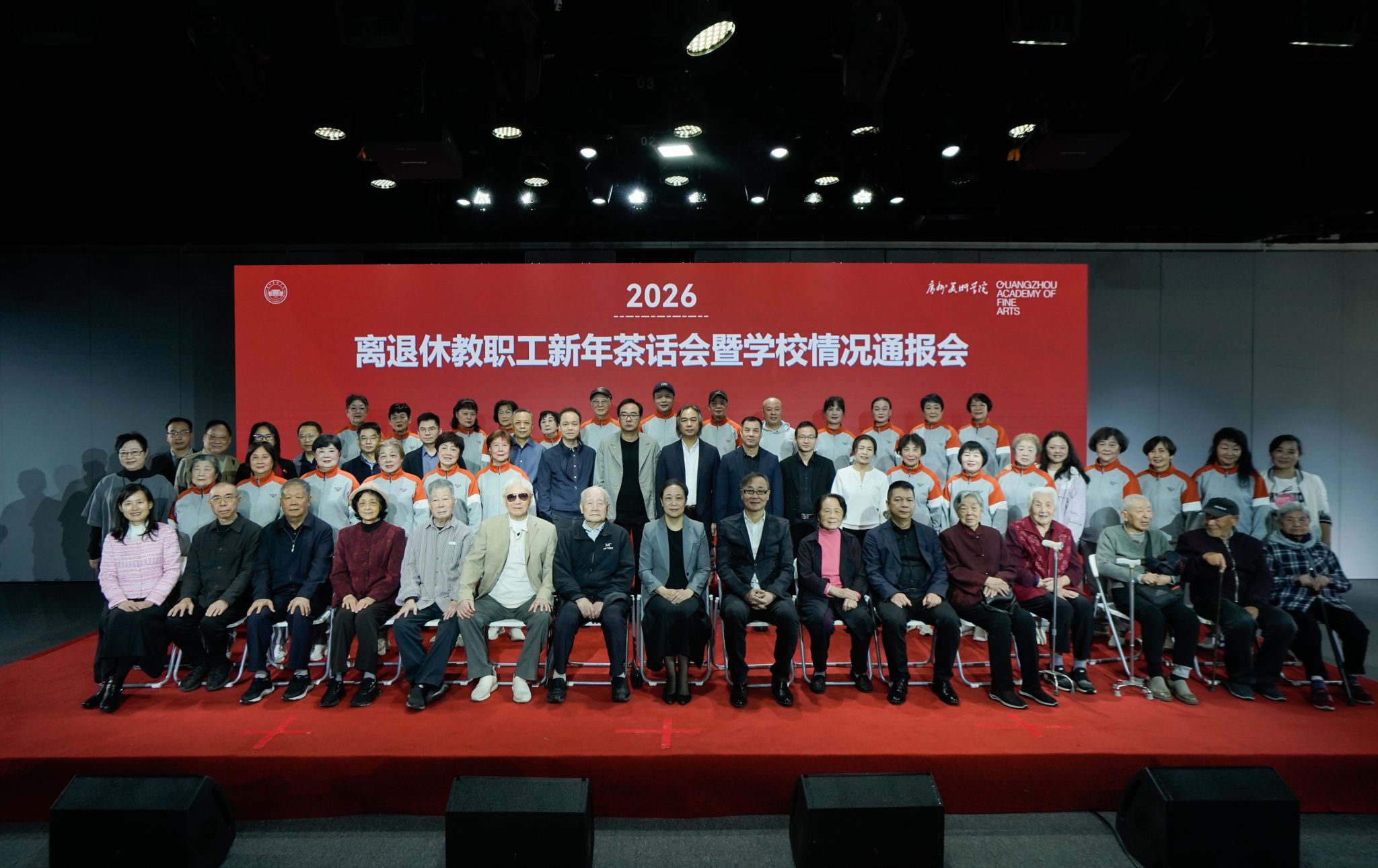岁序常易,华章日新。1月18日上午,广州美术学院2026年离退休教职工新年茶话会暨学校情况通报会在昌岗校区设计大楼1楼演播厅举行。老院长郭绍纲,原党委书记杨珍妮,原副院长潘行健、吴卫光,原党委副书记许怀升、穆林等学校老领导,学校党委书记林蓝,院长范勃,党委副书记宋光智,副院长蔡拥华、李金水、李勇,以及相关职能部门负责人、离退休老同志出席了茶话会。离退休工作办公室主任黄国权主持。