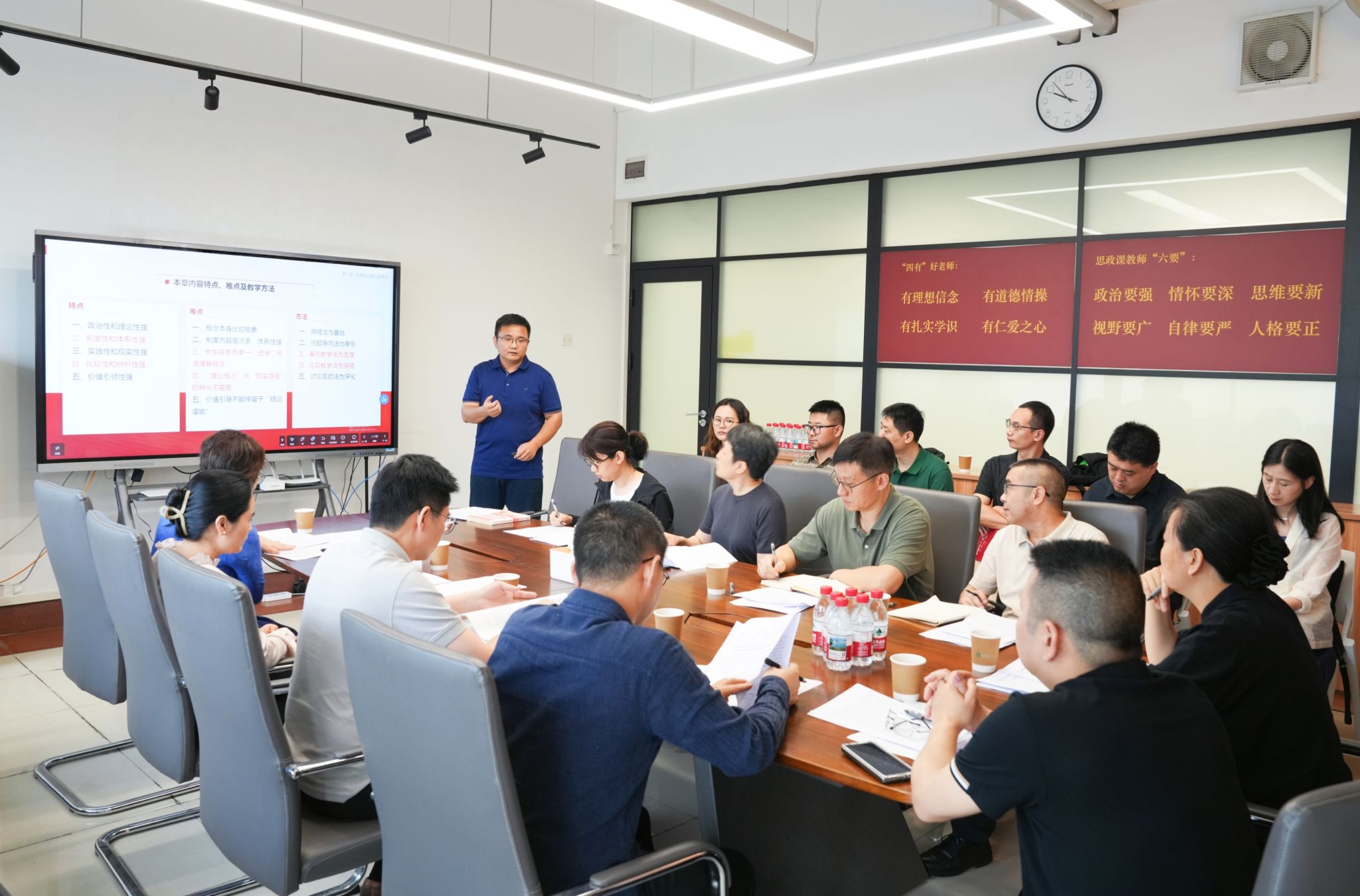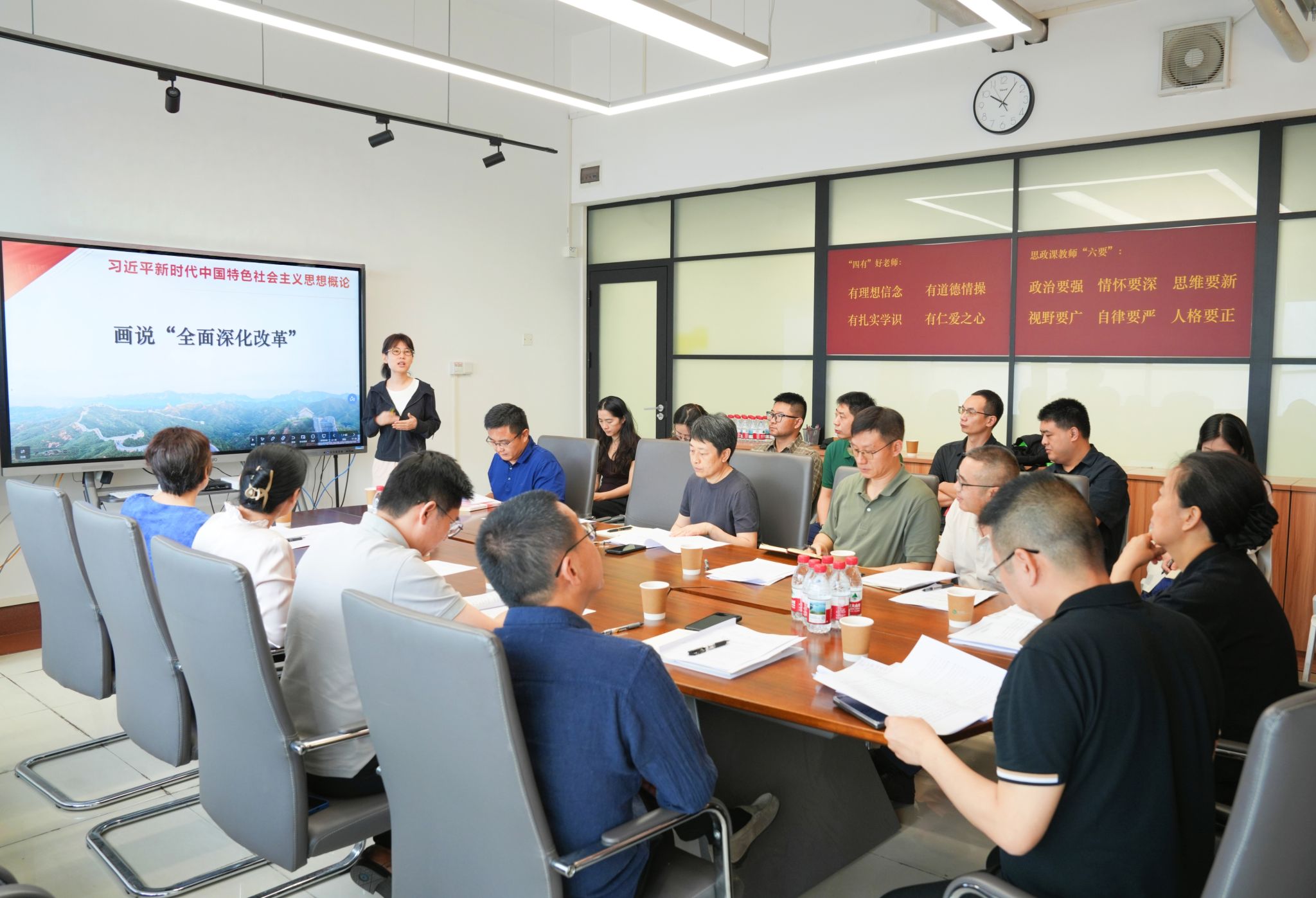 本次集体备课会既是一次教学研讨,更是一次严肃的政治练兵。会上,马克思主义学院两位青年教师代表进行了精彩的示范性说课。王彪博士以《发展全过程人民民主》为题,结合教学重点,在古今中西比较中深入剖析了中国特色社会主义政治制度的显著优势与逻辑机理,展示了扎实的理论功底;王越赞博士以《画说全面深化改革》为题,巧妙地将思政元素与美术学科特色相结合,通过图像语言生动阐释理论内涵,为与会教师提供了鲜活的教学示范。