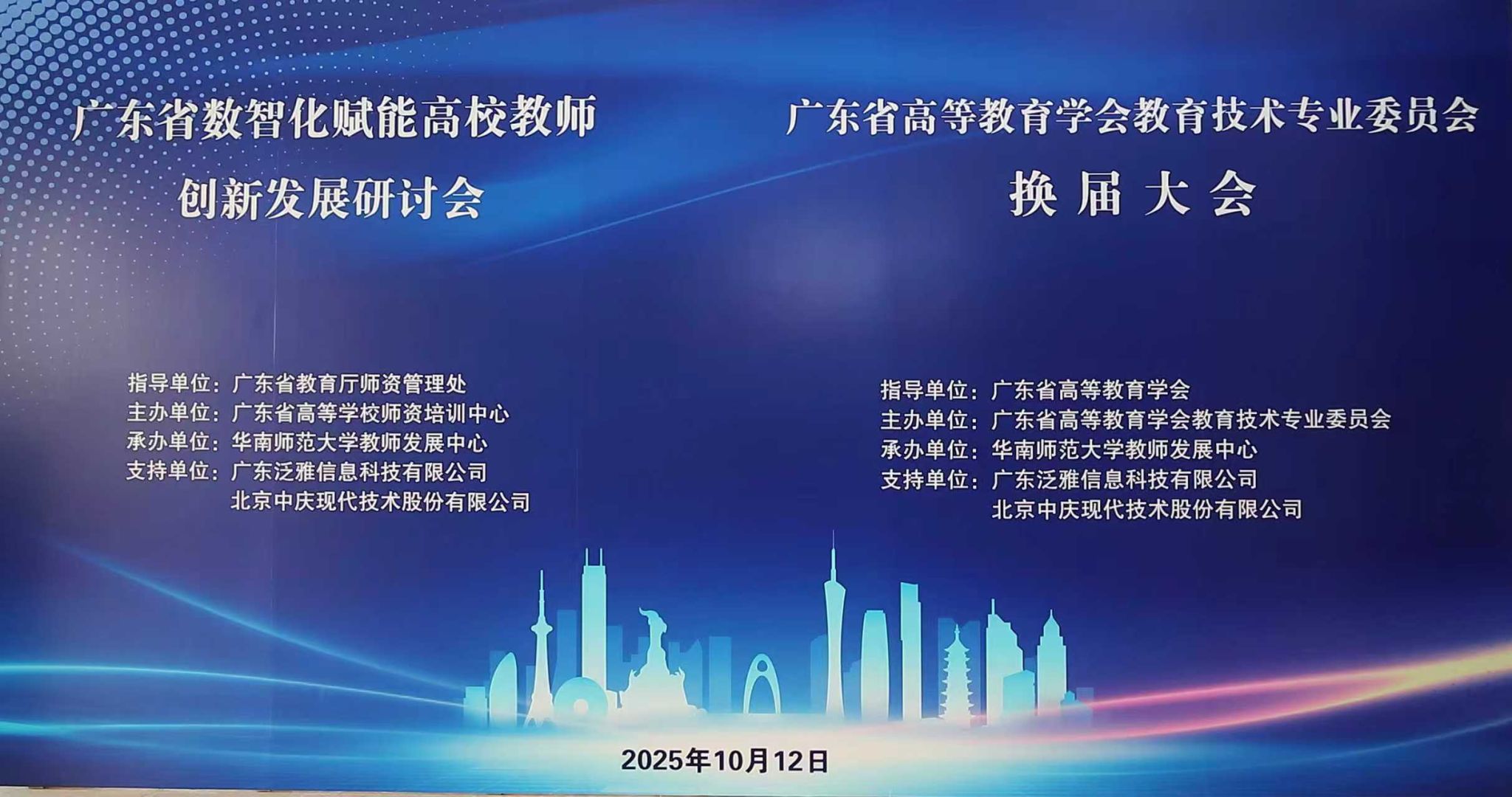 近日,首届广东省数智化赋能高校教师发展研讨会暨广东省高等教育学会教育技术专业委员会换届大会在华南师范大学召开。我校应邀派代表参加了此次会议。