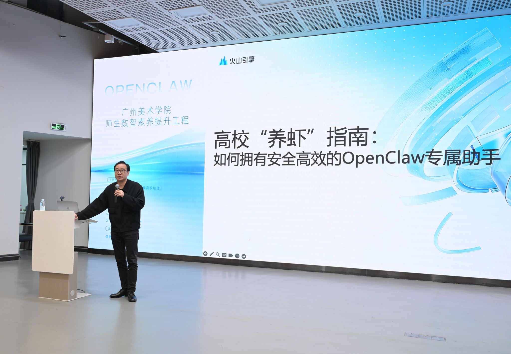 3月24日上午,“广州美术学院数智素养提升工程——OpenClaw('龙虾')专题讲座”在大学城校区900座报告厅举行。讲座特邀火山引擎解决方案高级经理许华珊担任主讲,围绕“高校‘养虾’指南——如何拥有安全高效的OpenClaw专属助手”这一主题,为全校师生带来一场系统深入的AI智能体技术分享。学校副院长李勇出席活动,信息技术中心主任陈泽生主持讲座。