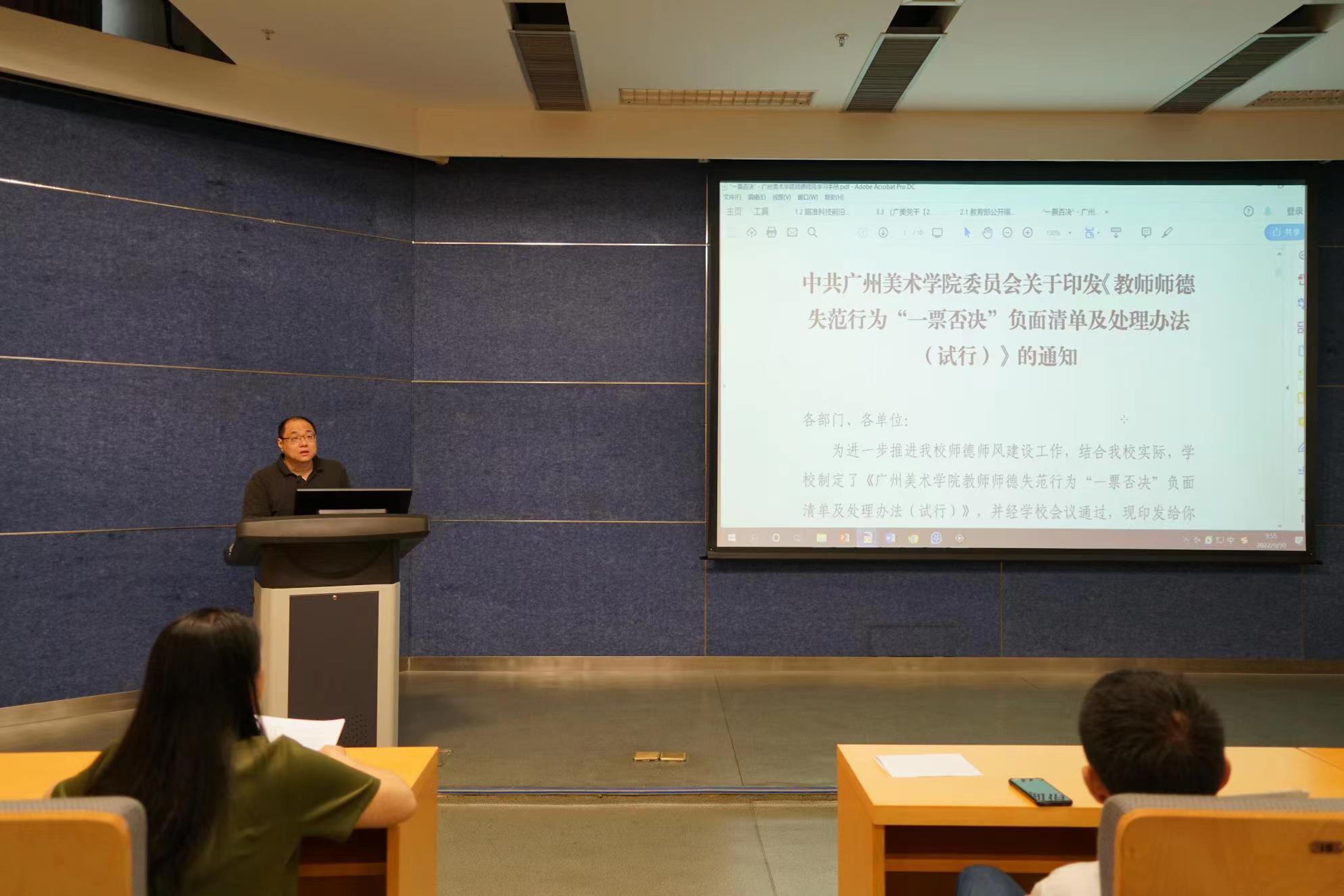 吴杨波详细解读了《新时代高校教师职业行为十项准则》和《高等学校教师职业道德规范》的内容,提醒老师们要坚守立德树人初心,恪守教师职业行为规范。阎安结合《广州美术学院教师师德失范行为“一票否决”负面清单及处理办法(试行)》、《教育部公开曝光第十批7起违反教师职业行为十项准则典型案例》进行深入分析和警示教育,引导全体教职工特别是党员干部自觉夯实清正廉洁的思想根基,以案为鉴,以案示警,以案促廉。会后,教职工观看了2022年“最美教师”先进事迹和纪律教育廉政微电影(家风篇)《桥》。