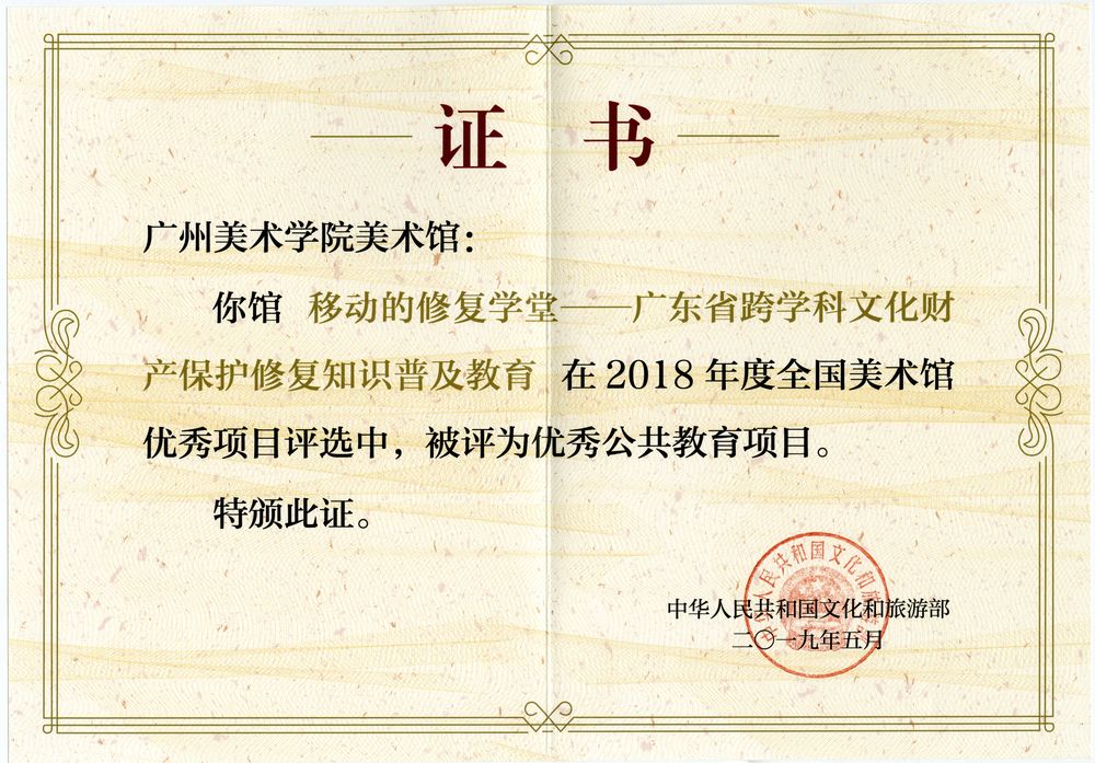 《移动的修复学堂——广东省跨学科文化财产保护修复知识普及教育》文化和旅游部2018年度全国美术馆优秀公共教育项目,2019.5