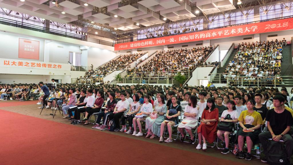 典礼在庄严的国歌声中正式开始,党委书记谢昌晶郑重地为新生代表佩戴校徽,标志着全体新生们正式成为广美学子。李劲堃发表了热情洋溢的致辞,代表学校对2018级新生的到来表示衷心祝贺和热烈欢迎。他以校训“先学做人、再事丹青”激励学生德艺兼修,以我校优良办学传统勉励学生志存高远、笃定而行。他结合“习近平总书记给中央美术学院老教授重要回信”精神,鼓励同学们坚定文化自信,坚持艺术为民,勇于开拓创新,树立崇高艺术理想。他希望同学们通读领会习近平总书记在文艺工作座谈会上重要讲话,以宽广的视野、高远的目标定位自己的艺术人生,并以胡一川、关山月、黎雄才、王肇民、潘鹤、杨之光等岭南大家的艺德人品为榜样,探索自己的艺术道路,严谨治学,坚定、扎实地肩负起文化艺术繁荣发展的未来。