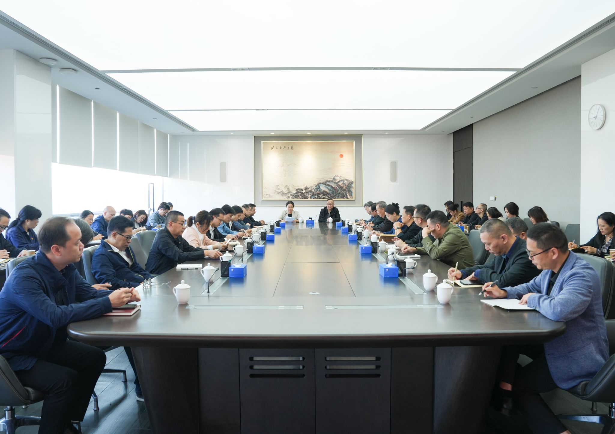 林蓝指出,我们必须把学习贯彻两会精神与学校办学定位、发展目标深度贯通,与高水平艺术类大学建设紧密结合,一是提高政治站位,把牢办学方向,以理论清醒保证政治坚定。要坚持学深悟透、融会贯通,将学习贯彻两会精神与学习贯彻党的二十大和二十届历次全会精神紧密结合,与贯彻落实习近平总书记对广东系列重要讲话和重要指示精神密切结合,与学习贯彻习近平总书记关于教育的重要论述、关于文艺工作的重要指示批示精神深度融合,深刻领悟“两个确立”的决定性意义,不断增强“四个意识”、坚定“四个自信”、做到“两个维护”。坚守为党育人、为国育才初心使命,确保广美始终沿着正确政治方向和办学方向稳步前进,为强国建设筑牢广美政治根基。二是凝聚思想共识,锚定国家需求,以统一思想引领育人质量提升。要把学习贯彻两会精神转化为凝聚全校共识、推动育人工作的强大动力,紧扣国家战略需求和区域发展实际,锚定高水平大学建设新起点,以思想统一引领行动一致,推动学校“冲一流”再上新台阶。深入落实立德树人根本任务,立足美术院校办学特色,科学谋划“十五五”发展蓝图,构建“艺科融合”战略服务体系,聚力攻坚“重大团队、重大平台、重大项目、重大成果”四大建设,深化艺科融合、科教融合、产教融合,持续优化学科专业布局,以学科建设引领育人质量提升。坚持以文铸魂、以艺赋美,完善人才培养模式,深耕湾区沃土,打造人文湾区艺术引擎,努力培育既懂国际语言又有中国气派的青年设计人才,为粤港澳大湾区建设、教育强国建设提供坚实的人才支撑。三是强化行动自觉,勇担文化使命,以艺术力量赋能文化强国建设。要全校上下凝心聚力、真抓实干,凝聚起推动发展的强大智慧和力量。要有推动学校高质量发展的信心和底气,以“制造硬实力+服务软实力”激活岭南文化新动能,围绕重大历史、重大现实、大湾区建设、乡村振兴、生态文明等主题,聚焦“五大”着力点,以“大作”立身,打造艺术精品力作;以“大展”搭台,提升公共文化服务职能;以“大师”铸魂,培育德艺双馨人才;以“大课堂”赋能,深化社会服务;以“大传播”扩圈,讲好中国故事、湾区故事、广东故事、广美故事,在服务文化强国建设、推动高质量发展中展现广美担当。