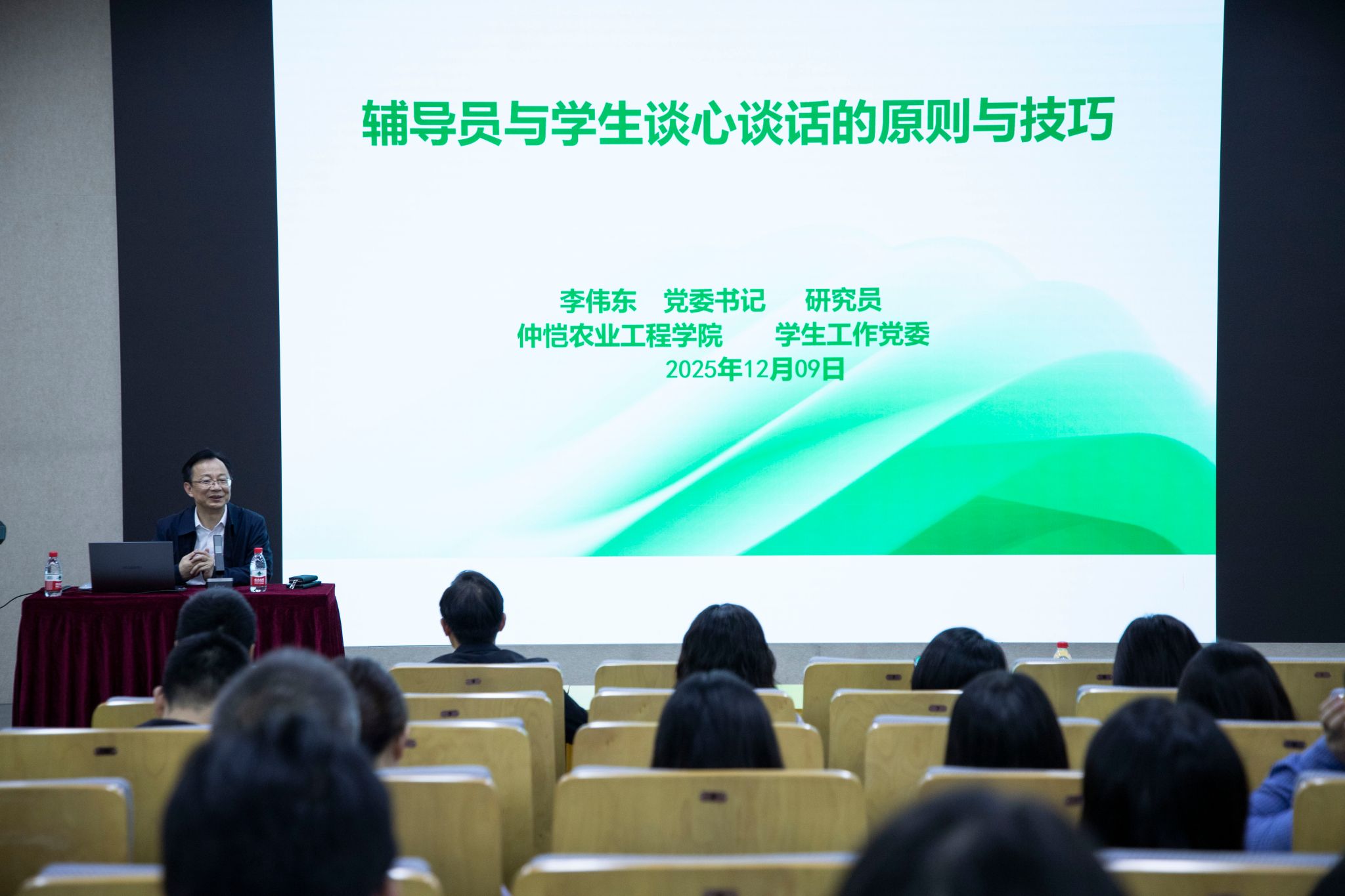 在讲堂环节,李伟东立足新时代高校学生工作的新特点,凭借扎实的工作积淀与丰富鲜活的实践经验,精准剖析了谈心谈话作为辅导员开展学生工作核心载体的重要价值,系统阐释了谈心谈话需要遵循的相互尊重、师生有别、因人而异等六大核心原则,细致分享了选好时机、善于提问、察言观色等十项实操技巧,并结合典型案例解析了不同场景下的谈话策略。他勉励全体辅导员要通过高质量的谈心谈话架起与学生的“连心桥”,当好学生成长路上的倾听者、引导者与陪伴者。讲座为在场辅导员破解谈心谈话中的难点堵点提供了清晰思路,为提升学工队伍专业能力提供了有力指导。